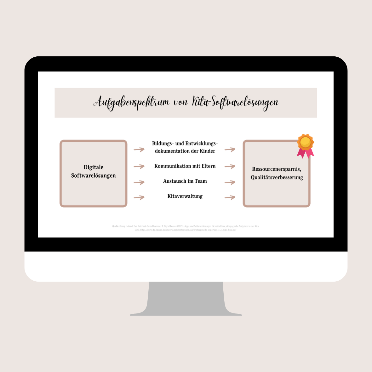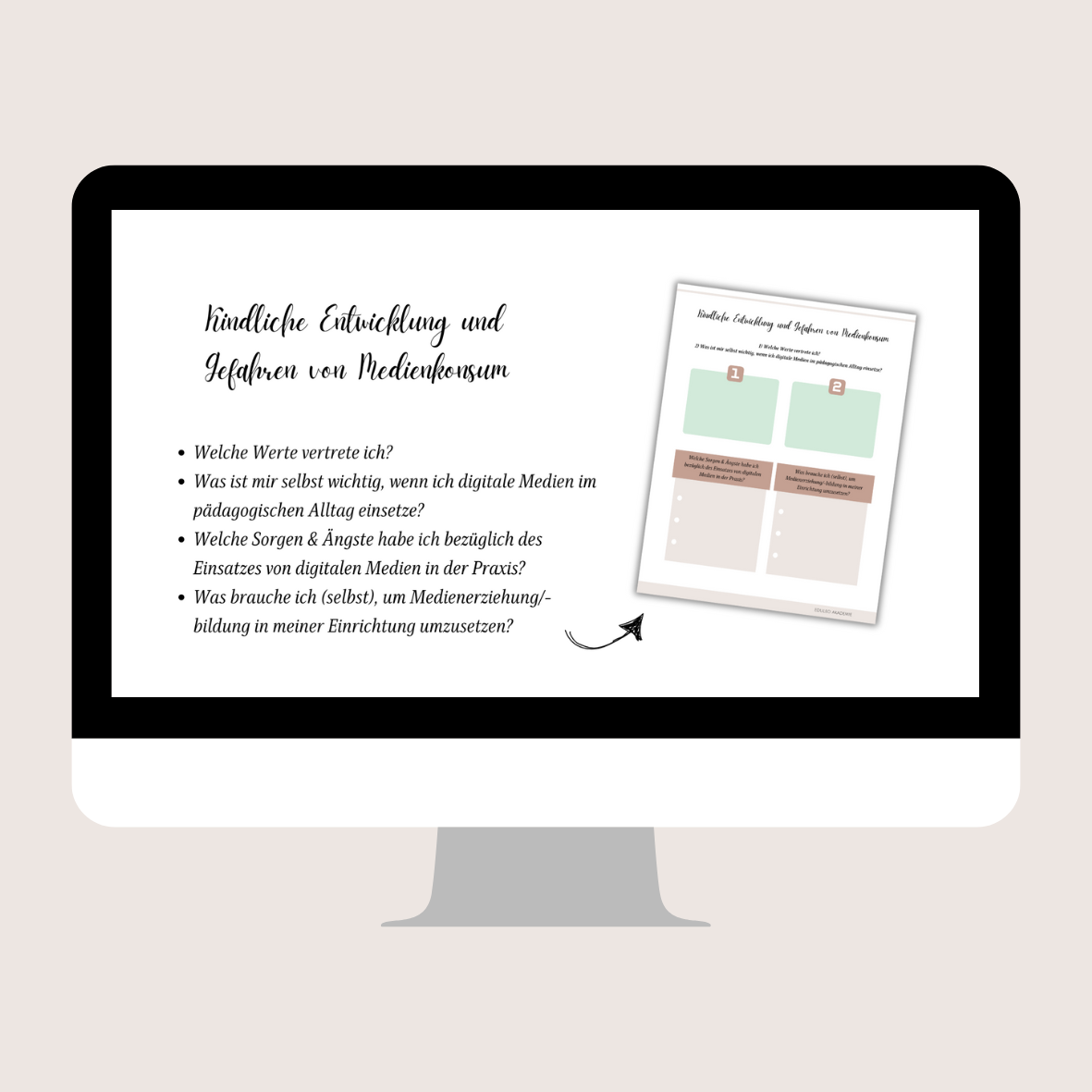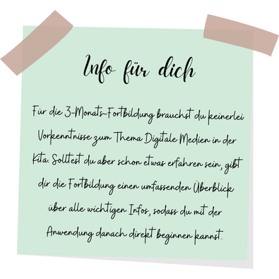 Die 3-Monats-Fortbildung schließt mit dem Zertifikat "Beauftragte/r für digitalen Medien in der Kita" ab. Es gibt eine allgemeine Einführung in die Medienpädagogik und die eigene Medienbiografie, es wird über die Chancen, Grenzen und Risiken in der Kita gesprochen und natürlich auch, wie mit ihnen umgegangen wird. Die kindliche Entwicklung und die Gefahren des Medienkonsums werden mit den Teilnehmenden interaktiv erarbeitet und eingeübt, sodass jede/r eine persönliche Stärkung erfahren kann. Daumenregeln sowie zahlreiche Umsetzungsideen und ein individuelles Medienkonzept werden im Rahmen der 3-Monats Fortbildung erarbeitet. Neben dem Austausch und Informationen gibt es ausführliche Vorlagen und Materialsammlungen für den Kita Alltag.